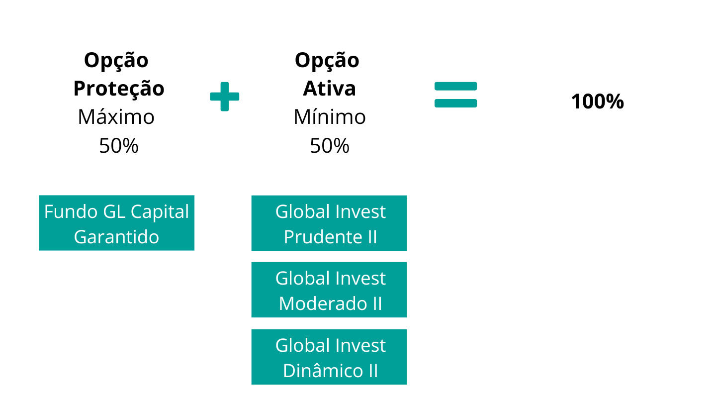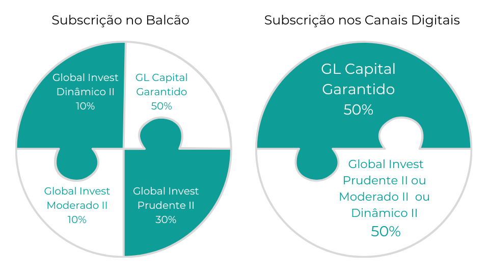 Na subscrição online a repartição do investimento será necessariamente de 50% na Opção Proteção (Fundo GL Capital Garantido) e 50% num único fundo dos três disponíveis na Opção Ativa (Fundos Prudente II, Moderado II ou Dinâmico II).