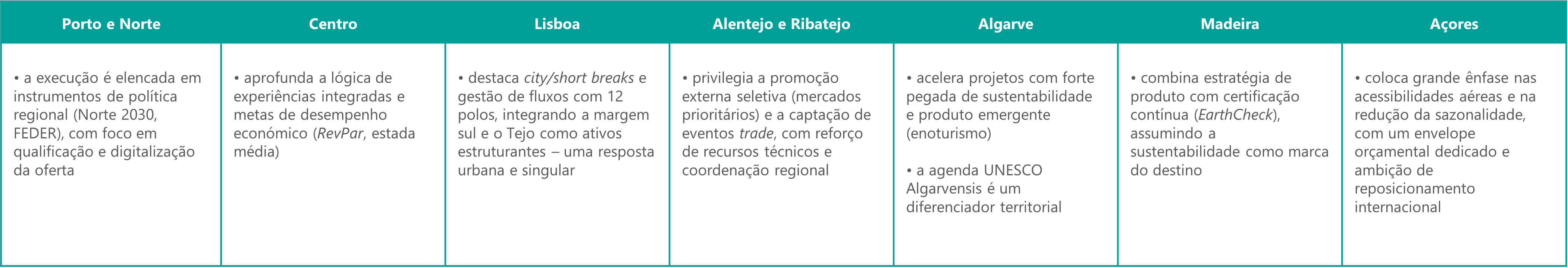 www.portoenorte.pt; Plano de Ação e Orçamento - Informação Institucional; www.turismodocentro.pt; Plano Regional de Desenvolvimento Turístico 2020-2030 e Plano de Marketing Turismo Centro de Portugal - Turismo Centro Portugal; www.ertlisboa.pt; ERT-RL - Plano Estratégico para o Turismo da Região de Lisboa 2020-2024; Apresentado Plano Estratégico para o Turismo da Região de Lisboa 2020-2024 | Viajar Magazine Online; Turismo de Portugal - Plano estratégico para o turismo da região de Lisboa 2020-2024 : Um novo ciclo / José Luís Arnaut; www.visitalentejo.pt; Planos de Actividades e Relatórios de Gerência - ARPTA - Quem Somos - O Alentejo - Turismo do Alentejo; www.visitribatejo.pt; Ribatejo afirma-se como destino turístico com plano ambicioso até 2026 (vídeos e fotos) - Mais Ribatejo; www.turismodoalgarve.pt; Turismo do Algarve - Plano de Atividades e Orçamento 2026 da RTA aprovado por unanimidade; www.visitmadeira.pt; Estratégia de "continuidade" para o Turismo da Madeira até 2027 assenta em seis pilares estratégicos; Certificação destino turístico sustentável - Madeira; Açores - Visit Azores; Visit Azores aprova Plano de Atividades e Orçamento para 2026 de 8 ME | Publituris; Estratégia Turismo 2035 apresentada em 18 de dezembro - Governo; Governo apresenta Estratégia de Turismo 2035 | opcaoturismo; Estratégia Turismo 2035; Estratégia Turismo 2035: Turismo de Portugal quer ouvir ideias e sugestões | Publituris; Governo apresenta hoje a Estratégia Turismo 2035 com foco na criação de valor e sustentabilidade; Novo e-book: Guia para a Gestão Autárquica do Turismo 25-29; Conselho Estratégico para a Promoção Turística reúne no Algarve para alinhar “prioridades nacionais e regionais” de promoção externa | Publituris;