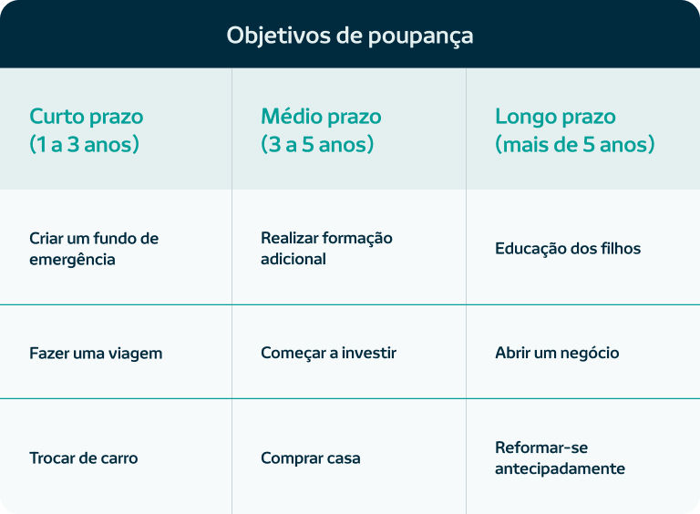 É importante que as suas poupanças tenham um objetivo. Assim, o primeiro passo é definir as metas que pretende alcançar. Os objetivos financeiros podem ser a curto, médio ou longo prazo.