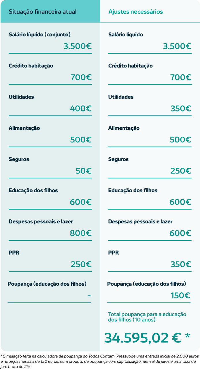 Com os ajustes realizados, o casal consegue libertar 250 euros mensais para a poupança. Aproveitam para reforçar em 100 euros o montante destinado ao Plano Poupança Reforma (PPR) [1] e fazem uma poupança regular de 150 euros para a educação dos filhos. Em 10 anos, conseguem amealhar 34.595,02 euros.