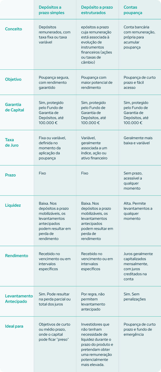 As contas poupança e depósitos a prazo tendem a oferecer taxas de juro inferiores. Já os produtos sem garantia de capital e com maior risco associado, como obrigações, podem ter rendimentos ligeiramente superiores.