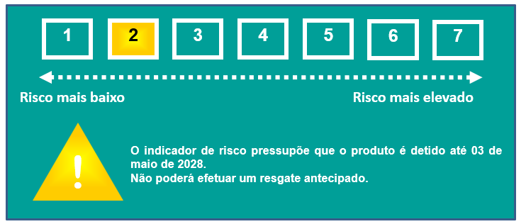 O indicador sumário de risco constitui uma orientação sobre o nível de risco deste produto quando comparado com outros produtos. Mostra a probabilidade de o produto sofrer perdas financeiras no futuro, em virtude de flutuações dos mercados ou da nossa incapacidade para lhe pagar. Classificamos este produto na classe de risco 2 numa escala de 1 a 7, que corresponde a uma baixa classe de risco. Esta classificação é ponderada por dois elementos: 1) o risco de mercado, que classifica as perdas possíveis decorrentes do desempenho futuro dos ativos subjacentes em baixo nível, e 2) o risco de crédito, que classifica como muito improvável que condições de mercado desfavoráveis tenham impacto adverso na nossa capacidade de lhe pagar.