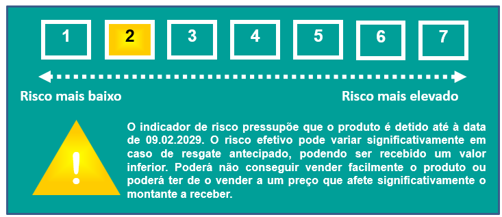 O produtor classifica este produto na classe de risco 2 numa escala de 1 a 7. Esta classificação é ponderada por dois elementos: 1) o risco de mercado, que classifica as perdas possíveis decorrentes do desempenho futuro dos ativos subjacentes em baixo nível, e 2) o risco de crédito, que classifica como muito improvável que condições de mercado desfavoráveis tenham impacto adverso na capacidade de o produtor/emitente lhe pagar.