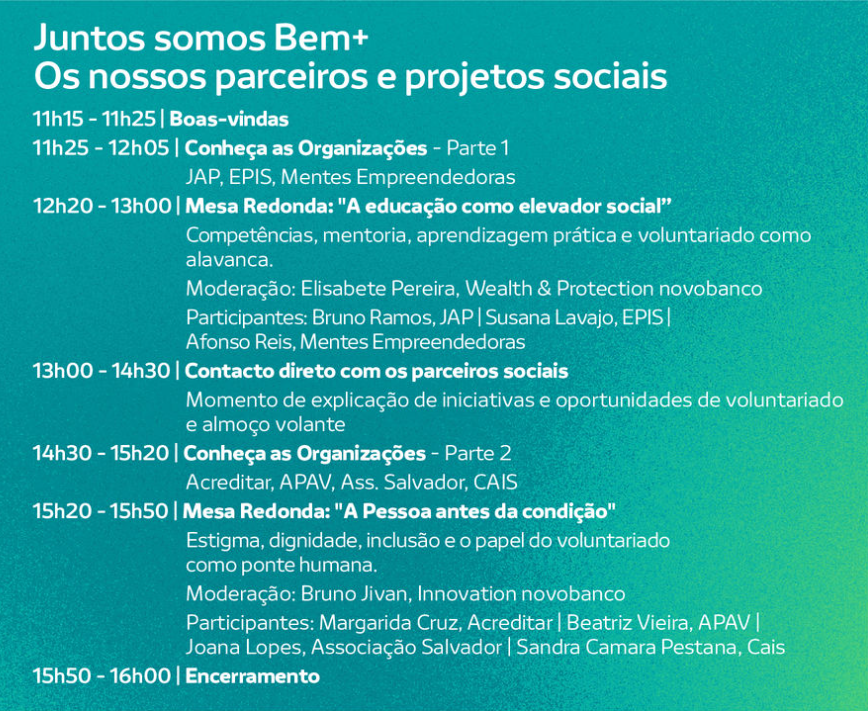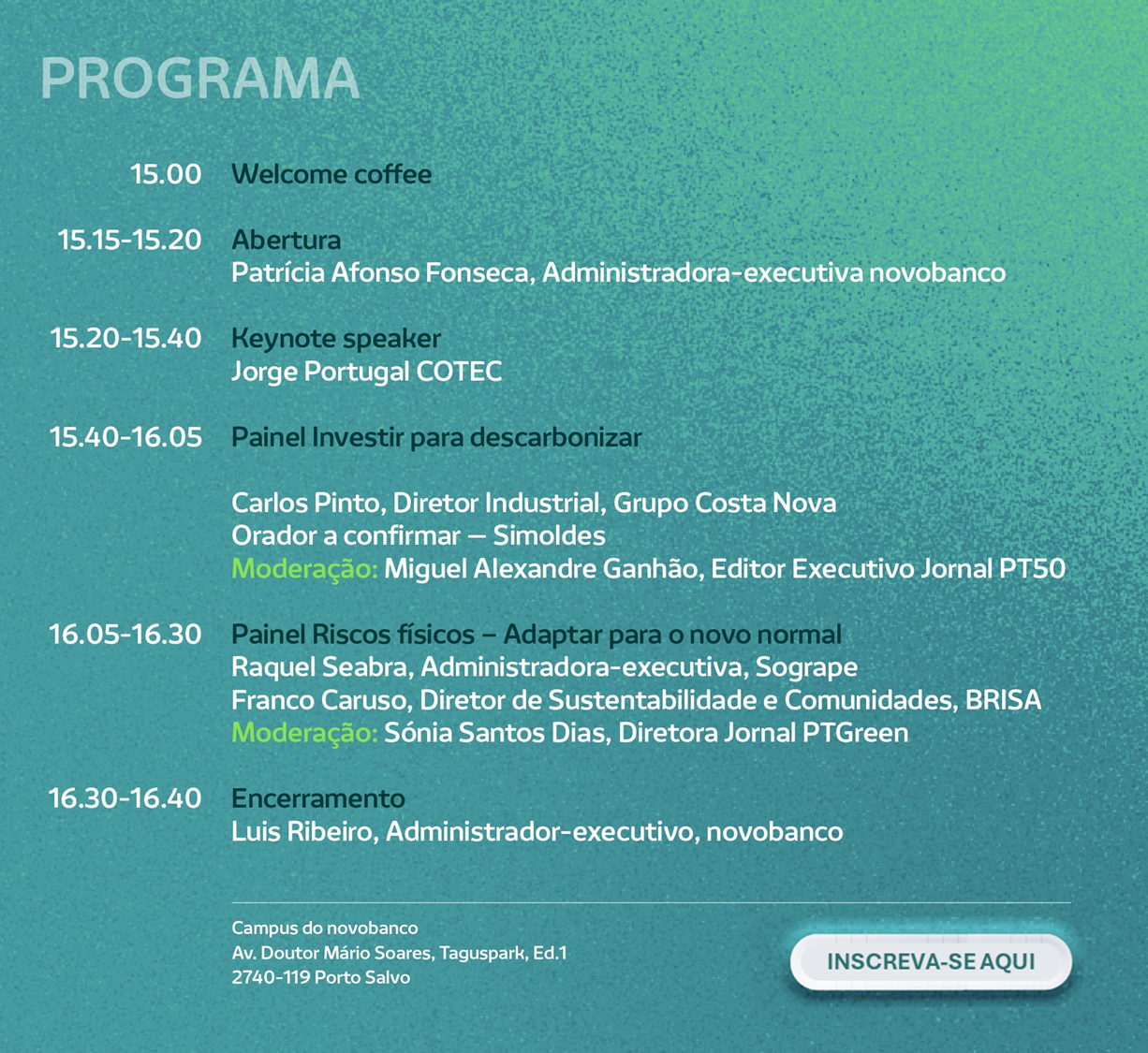 Entre 16 e 19 de março, o novobanco promove a Semana da Sustentabilidade 2026, uma iniciativa que reforça o compromisso do banco com a transição climática, a inclusão social e o desenvolvimento sustentável. Ao longo de quatro dias, o programa integra conferências, formações especializadas para colaboradores do novobanco, mesas‑redondas e iniciativas de impacto social, promovendo a partilha de conhecimento e o debate sobre os desafios da economia sustentável.