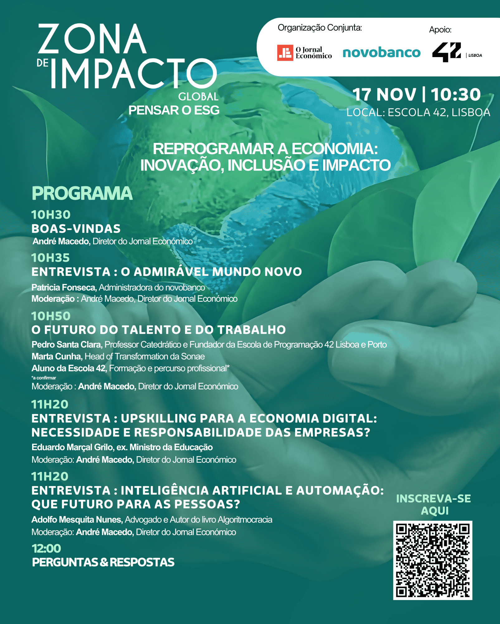 No dia 17 na Escola 42 tera lugar a última conferência do ciclo da Zona de Impacto Global, desta vez subjacente ao tema “Reprogramar a Economia: Inovação,Inclusão e Impacto”